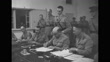 VS a crowded room of officers; General Joseph de Verdilhac, representative of the Vichy government, is handed documents by an aide in a white coat and signs armistice / British General Sir Henry Maitland Wilson, commander of Middle Eastern Allied Forces, signs armistice and an aide blots the signature / VS armistice signing / Free France General Georges Catroux, seated next to Wilson, signing documents / All watch carefully as the aide brings more items to sign / Verdilhac signing document / CU the signed armistice (illegible) / convivial military men chatting / Several movie cameras outside the 'Sidney Smith Barracks' / CUs of the officers and soldiers / A record player / A line of American sedans parked outside of the barracks / A wide shot of the barracks with a group of Australian soldiers on a porch / An Australian talks to a man taking notes / Camera equipment: "E P Genock, British Paramount News" printed on camera box / VS CU of a soldier and cap; illegible epaulet; CU of an officer / Pan to soldier