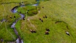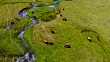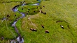 Pla de Beret in the Catalan Pyrenees with livestock grazing near river with mountain view.
