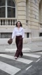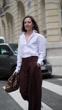 PARIS, FRANCE - DECEMBER 18: (SLOW-MO) Alba Garavito Torre wears a white Figaret shirt, dark brown wide-leg Prassos pants, a brown Tras mi Bolsa bag with leopard patterns, tobacco heels slingback penny loafers from Miu Miu, during a street style fashion photo session, on December 18, 2024 in Paris, France. (Footage by Edward Berthelot/Getty Images)