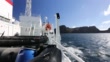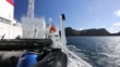 An expedition cruise ship entering the caldera of Deception island through Neptunes Bellows, in the South Shetland Islands off the Antarctic Peninsular which is an active volcanic caldera.