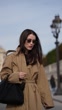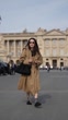 PARIS, FRANCE - OCTOBER 1: ( SLOW-MO ) Annabel Rosendahl wears long straight dark brown hair with a center part, round gold-framed sunglasses with dark lenses, small stud earrings, a black leather hobo bag, a black top layered under a camel cotton wrap trench coat with a wide draped collar, oversized long sleeves and a belted waist, outside Dior, during Paris Fashion Week - Womenswear Spring Summer 2026, on October 01, 2025 in Paris, France (Footage by Edward Berthelot/Getty Images)