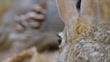 Extreme close up of a solitary antelope jackrabbit (Lepus alleni) chewing on foraged food, a Gambel's quail (Callipepla gambelii) walks past in the background, Tucson, Arizona, USA (FKAD626N - Clip taken from programme rushes - 333938)
