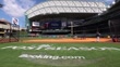 HOUSTON, TEXAS - OCTOBER 6: (EDITORS NOTE: Audio/music licensing is not included.) A ball is thrown during a workout prior to the ALDS series between the Houston Astros and the Minnesota Twins at Minute Maid Park on October 6, 2023 in Houston, Texas. (Footage by Carmen Mandato/Getty Images)
