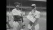 Title card: "Baseball - Old-Timers' Day at Yankee Stadium" / WS players on field and crowd in stands / crowd in stands / old-timers in dugout posing for photo opportunity / group of photographers and cameramen taking pictures / pan across old-timers in dugout / Jimmie Ring on left shaking hands with Frankie Frisch while posing / left to right Vernon "Lefty" Gomez, Waite Hoyt, Bill Dickey and Red Ruffing all posing / pan across Ruffing, Dickey, Hoyt and Gomez / Wally Pipp siting in chair catching ball / Al Schacht and comedian Joe E. Brown clowning around and posing / Hank Greenberg posing / two shots of Joe DiMaggio and current player Mickey Mantle posing / players assembled on field / Commissioner of Baseball Ford Frick presenting plaque to Eleanor Gehrig, widow of Lou Gehrig / she poses with plaque / WS players in action during game / Joe Judge hitting ball and running to first, Wally Pipp lying on ground next to first base / crowd in stands watching / DiMaggio at bat / Schacht on pitcher's mound / DiMaggio at bat / Schacht signals outfielders to back up / DiMaggio hits double and runs to second / crowd watching / WS players in action