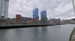 This is a panning shot of the Bilbao city skyline with views of the Nervion River from the northeast side. In this shot, we see the newest center of the city of Bilbao and to the right, we see the Zubizuri Bridge . In the center of this video, we see the old warehouse of the Franco port, which was located on the bank of the Nervion River, was rebuilt. In the 90s the warehouse was demolished from the inside and only its facade remains.Bilbao, Bizkaia, Spain - February 22, 2024