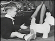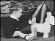 Boy playing on floor with mechanical, stuffed dog while daughter sits on her father's lap / boy playing / mother smiling down fondly at boy