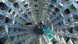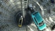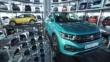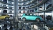 VW car delivery tower where the VW T-Cross (turquoise) and T-Roc (golden) models sit on the crane in Wolfsburg, Germany on Tuesday, December 4, 2018.