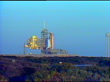 Challenger shuttle on the launch pad at dawn. CU top of shuttle. Flight crew in blue jumpsuits walk into elevator. Press and media people waiting behind a rope for the crew to come out. The crew walks out towards the camera. They board the NASA van that will take them out to the launch pad.