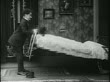 B/W 1916 Charlie Chaplin getting knocked over + bounced by bouncing Murphy bed in room