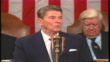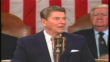 Close up head on shot of President Ronald Reagan, speaking at a lectern with an old-fashioned microphone atop it. Behind him are the stripes of an American flag. Speaker of the House Tip O'Neill is sitting behind him, as is Vice President George H.W. Bush, whose face is only barely visible at times. Reagan wears a dark blue suit and tie. He says: "Thank you for allowing me to delay my address until this evening. We pause together to mourn and honor the valor of our seven Challenger heroes, and I hope that we're now ready to do what they would want us to do. Go forward, America, and reach for the stars." Crowd applauds. Cut to medium shot of Senator and former astronaut John Glenn sitting in the audience, applauding and looking down. He is surrounded by other members of Congress.