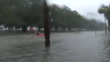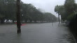 Close up of flooded fire hydrant zoom out to woman kayaking along flooded street in Charleston.