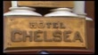 Closeup view of bronze plaques on the facade of the Chelsea Hotel, including plaque in memory of Brendan Behan and the Chesea Hotel Landmarks of New York plaque.