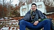 Caucasian man sitting in front of motorhome in cold winter morning, talking mobile phone, dressed in sleeping bag