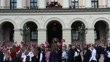 OSLO, NORWAY - MAY 17: (L-R) Crown Prince Haakon Magnus, Prince Sverre Magnus, Crown Princess Mette-Marit, Queen Sonja and King Harald attend the children's parade at the Royal Castle on Norway's National Day on May 17, 2023 in Oslo, Norway. (Footage by Per Ole Hagen/Getty Images)