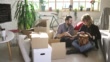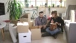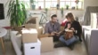 Cute couple sitting in new home around unpacked boxes - 4K stock video