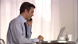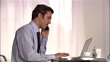 Dolly right to professional man talking on cell phone while working on laptop in cafe / getting off phone - HD stock video