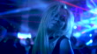 Dreamy girl dancing in a nightclub with a ton of lasers and strobe color lights around her, moving in slow mo and double layers video