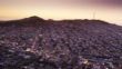 Aerial shot of San Francisco, California at sunset, flying over Bernal Heights Park, looking across Noe Valley towards Sutro Tower.