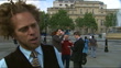 Empty plinth in Trafalgar Square to be occupied by living sculpture; 'Model For A Hotel' sculpture by Thomas Schutte on fourth plinth Gormley greeting volunteerYoung woman dressed in black standing on red boxAnthony Gormley (Artist) interview SOTRow of volunteersPressGormley next to volunteers as posing for photocallVolunteersVox pops volunteersReporter to cameraVolunteer banging tambourine while playing penny whistleVolunteers including man wearing purple underpants and man dressed as 'Where's Wally' characterGeneral view Trafalgar Square lions and volunteersBack view purple underpants man