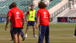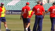 England team training; ENGLAND: London: The Oval:EXTIan Bell injures his knee playing touch rugby during England cricket team training sessionThe team continue to play touch rugby during training session / Close up of Ryan Sidebottom
