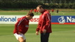England training session; ENGLAND: Hertfordshire: London Colney:EXTFabio Capello (Manager England football team) and fellow coaching staff towards, followed by England and Chelsea FC players Joe Cole, Wayne Bridge and Ashley Cole / David Beckham (LA Galaxy) along / Steven Gerrard (Liverpool FC) along, Wayne Rooney (Manchester United) and Glen Johnson (Portsmouth FC) / Stewart Downing (Middlesbrough FC), Paul Robinson (Blackburn Rovers), Theo Walcott (Arsenal FC) along / Matthew Upson (West Ham United), Emile Heskey (Wigan Athletic) and Frank Lampard (Chelsea FC) / David Bentley (Tottenham Hotspur) alongGerrard and Rooney stretching / John Terry (England Captain) and Rio Ferdinand (Manchester United) along to hold banner / Whole England squad posing for photocall with 'Stop Knife Crime' banner