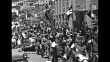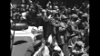 Faisal wearing elaborate uniform, stands at microphones, is handed copy of speech / pan of him in carriage with a uniformed officer and mullah / aerial of Baghdad / montage of procession and crowd, includes military vehicles and soldiers, also car with King's uncle Abd al-Ilah wearing uniform and saluting