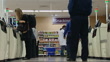 Fall in supermaket sales: General views inside Tesco store; Various of shoppers at self-service checkout / Man paying for food using chip and pin card reader / Man taking receipt and bag / Woman on self-service checkout placing items in bagging area / Woman selecting payment type on screen / Woman paying for banana / Woman shopper collecting change then taking shopping bag / Man putting ten pound note in self-service checkout / Close shot Visa card in chip and pin device / Low angle shots check-out area