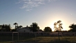 Panning view of a farming community in spring at sunset. Sun viewed through tree.