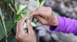 A farmer manually pollinates a vanilla flower by carefully transferring pollen using their fingers. The delicate process ensures vanilla bean production, essential for cultivation in non-native regions.
