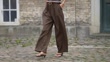 COPENHAGEN, DENMARK - AUGUST 5: (SLOW-MO) Felicia Akerstrom wears a short-sleeved polo shirt with horizontal stripes in shades of brown, white, and black. The shirt features a dark collar and a partial button placket. Paired with high-waisted, wide-leg trousers in a rich brown fabric, the trousers have pleats and a black belt with a gold buckle. Accessories include small, oval-shaped sunglasses, gold hoop earrings, and a silver wristwatch. A brown leather shoulder bag with a smooth finish is carried. Footwear consists of black thong sandals with a low heel. Hair is styled in loose waves, outside Skall Studio, during Copenhagen Fashion Week on August 5, 2025 in Copenhagen, Denmark. (Footage by Edward Berthelot/Getty Images)