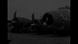 VS B-17 Flying Fortress airplanes land as they return from successful bombing mission over Germany during World War II; US Army Air Corps logos can be seen on planes / crew member lowers bag containing the bomb sight out of the plane as an MP stands by; another man takes it; the two men carefully carry the bag away / solemn crew member in flight gear / CU inscription on back of bomber jacket "Carter's Little Pills"; man wearing jacket turns to face camera with big smile; he wears cap with "Shirley" written on underside of the bill / solemn crewman / images of bombs painted on side of plane to represent missions; tilt down painted image of man in cloud throwing bomb below; pan to glass cockpit with panel blown out / damaged B-17 lies on ground / jeep pulls trailer bearing bombs past B-17 in background / CU bullet hole and cracked glass in cockpit / damage to plane; tilt up mechanics examine it / Note: exact day not known