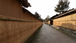 POV, walking along the wall of former Samurai residence which is covered by straw belt called "Komokake" to protect from freeze at dusk; it is located in Kanazawa's former samurai district called Nagamachi