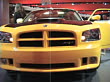 MS front end of Dodge Charger Super Bee revolving on turntable / WS rear end of car / MS front half of passenger side profile / CU Super Bee fender emblem; ZO to MS driver side profile / CU Super Bee decal on rear fender; CU rear end; MS front end 2007 Dodge Charger SRT-8 Super Bee montage at Cobo Hall on January 19, 2006 in Detroit, Michigan (Footage by Getty Images)
