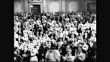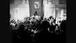 Generalissimo Francisco Franco walks down a street in Madrid with his generals as crowd watches and waves flags from the sidewalks / Franco shakes hands with line of dignitaries in military uniform who salute him / crowd applauds enthusiastically / delegates applaud as Franco walks through parliament escorted by guards / room filled with applauding members of parliament / Franco acknowledges applause with a nod / gives speech from podium / parliament stands and applauds.
