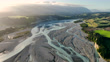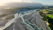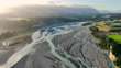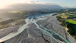 Top looking down at Rakaia river with its turquoise water in Canterbury, New Zealand.