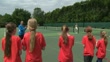 Wimbledon 2021: Harriet Dart reached mixed doubles final and is inspiring next generation of players; ENGLAND: Wandsworth:EXTCoach with youngsters on a tennis court clapping as Harriet Dart (Wimbledon finalist - tennis player) arrives