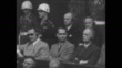 Hermann Goering sitting in prisoner's dock with hand over forehead, Rudolf Hess sitting next to him looking at camera / defendants sitting in dock, in front row left to right Goering, Hess, and Joachim von Ribbentrop, in row behind them left to right Karl Doenitz and Erich Raeder, US MPs standing behind them / close shot of defendant Hjalmar Schacht / shot of defendant Franz von Papen smiling / sitting in dock von Papen, Schacht, and Hans Fritzsche leaning over talking to man in front of him / overhead shot of Goering, Hess and von Ribbentrop sitting in dock