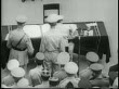 B/W 1945 high angle REAR VIEW MacArthur hands pen to General Percival at Japan's surrender / U.S.S. Missouri