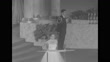 High angle shot actress Mercedes McCambridge announces Best Supporting Actor award at the 26th Annual Academy Awards at Pantages Theatre in Hollywood, receives envelope, jumps with excitement at podium, turns around as man in background reaches for Oscar award from table