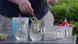 Preparing lemonade in back yard. Mixture of water, granulated sugar and lemon juice. Putting lemon verbena leaves in liquid. Putting drinking straw in drinking glass.
