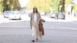 MUNICH, GERMANY - OCTOBER 16: Influencer Annette Weber, wearing a white shirt by Seidensticker, a light brown blouse by Seidensticker, a brown pullover by Max Mara, beige leather jogging pants by Brunello Cuccinelli, brown loafers by Gucci, a beige bag by Tiefenbacher Lehmann, sunglasses by Isabel Marant, and a chain by Ariane Ernst, during a Streetstyle shooting at on October 16, 2021 in Munich, Germany. (Footage by Streetstyleshooters/Getty Images)
