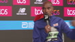 Sir Mo Farah is interviewed by pundit Tim Hutchings and journalists at post-marathon press conference.