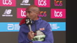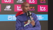 Sir Mo Farah is interviewed by pundit Tim Hutchings and journalists at post-marathon press conference.