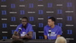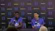 DURHAM, NORTH CAROLINA - SEPTEMBER 27: Khaman Maluach (L) of the Duke Blue Devils speaks to the media about watching former Duke player Zion Williamson compete, and director of player development Justin Robinson speaks to Maluach's improvement as a player, during Duke Men's Basketball Media Day at Cameron Indoor Stadium on September 27, 2024 in Durham, North Carolina. (Footage by Lance King/Getty Images)
