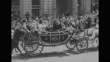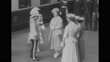 Title: "King Feisal of Iraq Visits Britain" superimposed over King Faisal II of Iraq in carriage with Queen Elizabeth II of England and her husband Philip, Duke of Edinburgh / WS Queen Elizabeth and Philip on platform as Faisal's train arrives / CU Queen Elizabeth, her mother Queen Mother Elizabeth, and Philip watching / CU Queen Elizabeth / MS King Faisal steps off train, salutes, takes off hat and kisses Queen Elizabeth's hand, then shakes hands with Philip - Abd Al-Ilah (Crown Prince), uncle of Faisal II of Iraq who was former Regent, on left / Faisal steps forward and greets the Queen Mother, shakes hands with Princess Margaret, and continues meeting others / CU Faisal meets Prime Minister Anthony Eden as Elizabeth introduces them / CU Faisal meets Admiral Earl of Burma Louis Mountbatten / CU Faisal / CU Faisal and Elizabeth talking as they walk off toward carriage / Angle view guards at attention / Side view Faisal, Elizabeth, and Philip in carriage ready to start journey to Buckingham Palace / Follow shot of Life Guards leading procession thru streets / CU crowds watching, taking pictures / Follow shot of Royal carriage rounding corner / LS crowds watching / LS procession of horse guards / Side view and CU procession and carriage down mall toward Palace / Follow shot of carriage thru street / WS carriage entering palace followed by horse guards / MS guards seen thru iron fence / Pose L to R: Crown Prince Abd al Ilah, Elizabeth, Faisal, and Philip