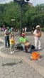 Little boy in a yellow pikachu shirt and green shorts performs with a kazoo with a reggae jazz band who play the trumpet, drums, and shakers at a park in New York (Footage by Collab via Getty Images UGC)