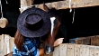 There is two young woman,a t horse ranch. They wear a casual clothing and a hat. They petting a horse, feeding him, and ride him. Its a sunny day outside.