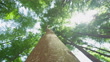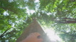 Slow motion POV shot of a man's hand touching a tree trunk. Low angle view of tree canopies.