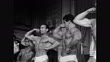 / men in bikini briefs stand on stage being judged for Mr Universe contest / men flex their muscles for the audience. Mr. Universe Contest on June 10, 1955 in London (Footage by Getty Images)