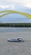 Metal eye bolt and mooring rings made of steel for attaching ropes to anchor boats at the dock, at the edge of bay of water, against yellow tied arch bridge.